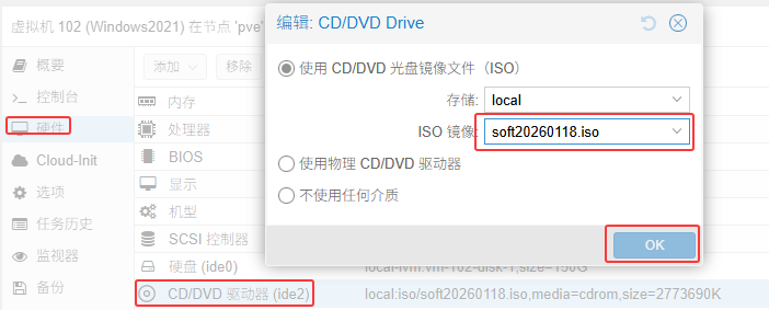 在需要添加的虚拟机例如102:硬件→CD/DVD驱动器→ISO镜像下拉选择soft20260118.iso→OK,这样镜像写入到光驱内了