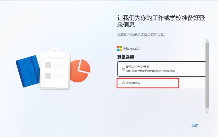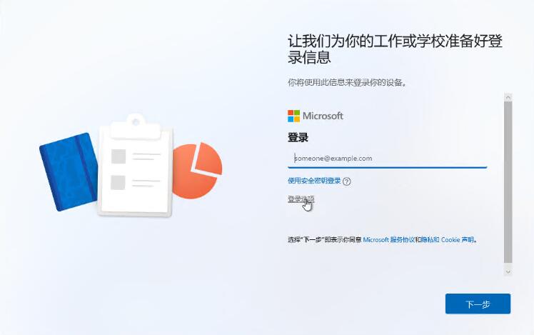 进入输入微软账户,点击【登录选项】选择【改为域加入】输入本地用户后完成设置,进入系统桌面