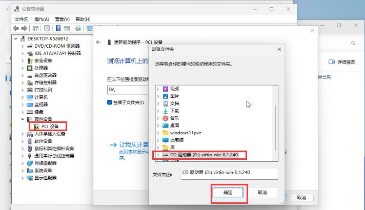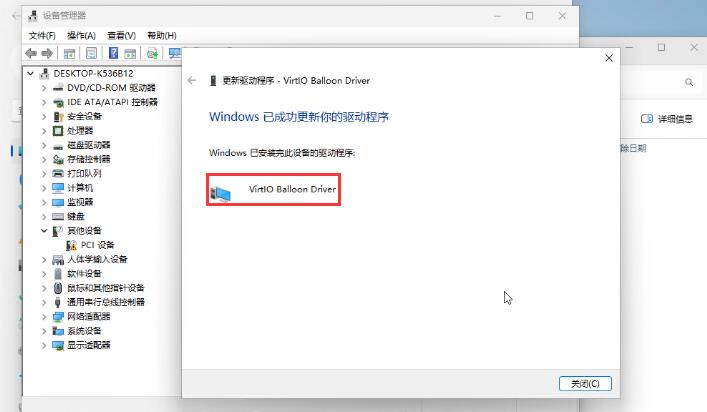 设备管理器查看,如果缺少pci的硬件驱动,右键→更新驱动程序→浏览我的电脑以查找驱动程序→浏览CD驱动器virtio-win-0.1.240.iso→确定→搜索自动安装完成,系统安装全部完成