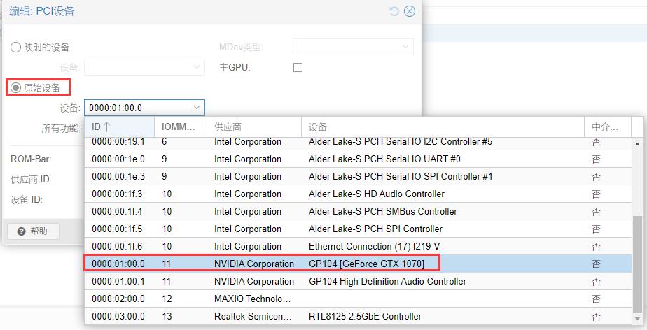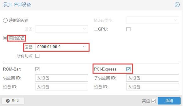 右下角勾选√ 高级:硬件→添加pci设备→原始设备→找到显卡比如1070如下图→pci-express 勾选 √→添加完成