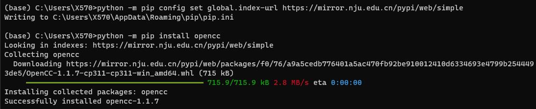python -m pip config set global.index-url https://mirror.nju.edu.cn/pypi/web/simple #国外pip的镜像改为国内 python -m pip install opencc #执行安装命令