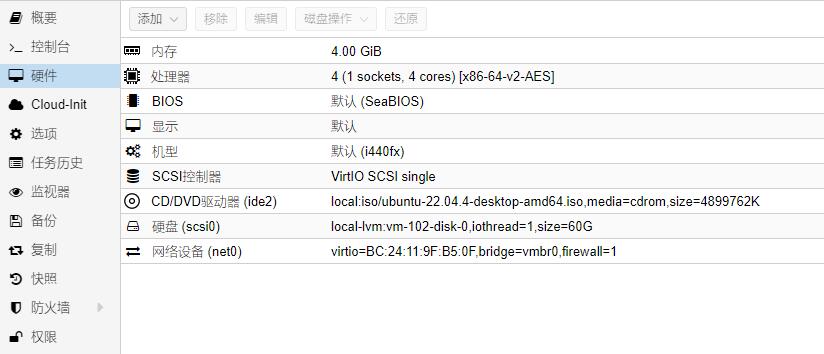 操作系统:存储local(pve)→ISO镜像→上传ubuntu-22.04.4-desktop-amd64.iso镜像,在使用CD/DVD光盘镜像文件(ISO),ISO镜像下拉选择该镜像文件