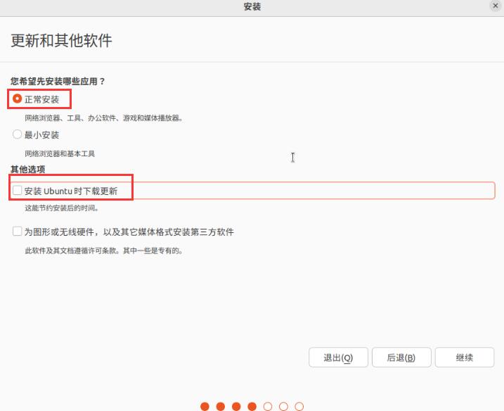 其他选项:安装ubuntu时下载更新去掉 勾选,方框取消√