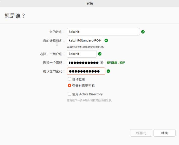 姓名例如kaixinit,计算机名和用户名自动填入,输入2次用户密码
