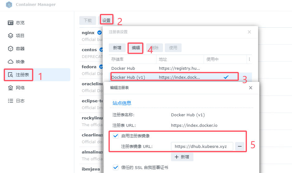 【Container Manager】→【注册表】→【设置】→【Docker Hub(v1)】【 编辑】→勾选【√】【启用注册表镜像】【注册表镜像URL】 :目前可用地址:【https://dhub.kubesre.xyz】→【应用】→重启应用完成,如下图: