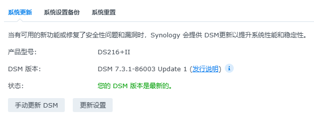 - 您的 DSM 没有需要修正的项目。系统将根据服务状态及系统设置来评估是否需要更新至此版本。