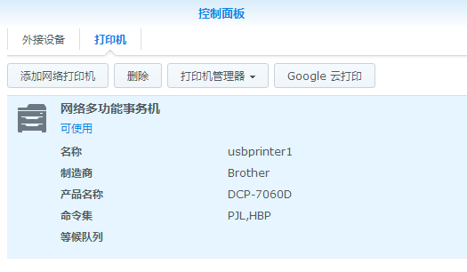 一、首先把打印机的USB端插入群晖的USB上,会自动识别驱动的,建议不要用集线器USB,可能会造成不识别
