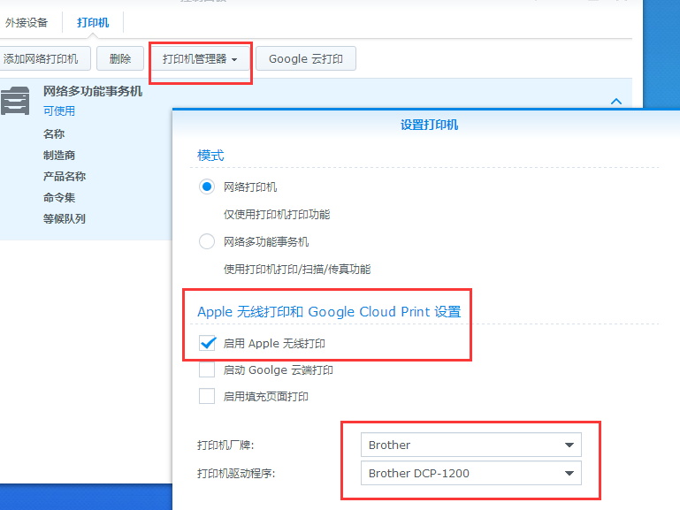 如果要使用apple无线打印,要这样操作,打印机管理器-设置打印机,如下图,启用apple无线打印打√,驱动考虑到没有找到7060D的下拉选项驱动,只好找就近的相似的驱动程序,这个要看运气了,我这样选择,一切可以正常使用。