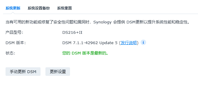- 您的 DSM 没有需要修正的项目。系统将根据服务状态及系统设置来评估是否需要更新至此版本。