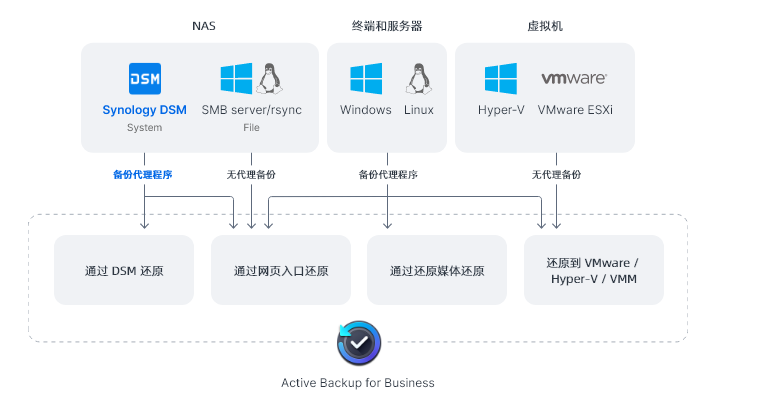 Synology Active Backup for Business 是一体化备份解决方案,设计用于在企业的多样化 IT 环境中简化和增强数据保护。保护和备份存储在 Windows 设备和 Linux 物理服务器上的数据之前,需要在用于执行设计的备份任务和存储备份数据的目标设备上安装 Active Backup for Business 代理程序。因为管理是在服务器端集中进行,所以大多数操作都需要 DSM 或设备的管理权限。