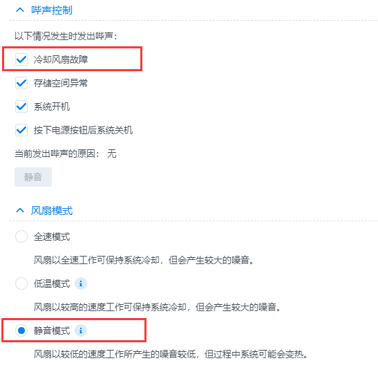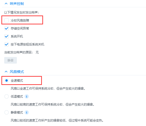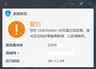 本站长群晖DS216+II因突然断电两次,再次开机进入桌面后,出现报警声,提示冷却风扇故障,重装系统后故障依旧,借鉴网路上结合实际操作的处理方法如下: