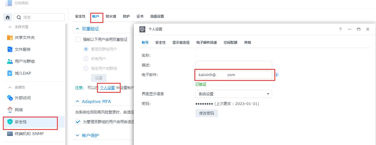 如果在群晖主机账户设置了电子邮件也可以发送OTP验证码进行验证,电子邮件设置方法如下: