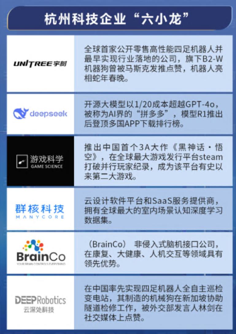 二是高校与科研支持:浙江大学等高校在人工智能、机器人、脑科学等领域的布局,为“六小龙”提供了底层技术支持和人才储备。