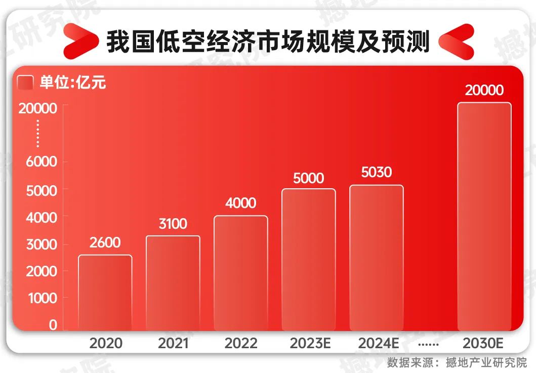 数据显示,2022年低空经济对国民经济的综合贡献值约为4000亿元,同比增长29.03%。据产业研究部门预测,2023年我国低空经济规模超5000亿元,2030年有望达到2万亿元。