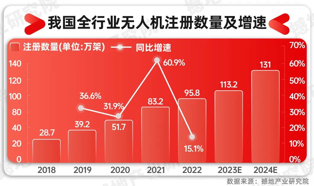 近年来,中国无人机注册数量快速增长,据统计,目前以深圳为核心的广东省消费级无人机产量占全国的90%以上,工业无人机占据国内60%左右的市场份额,其产值规模超过千亿元以上。