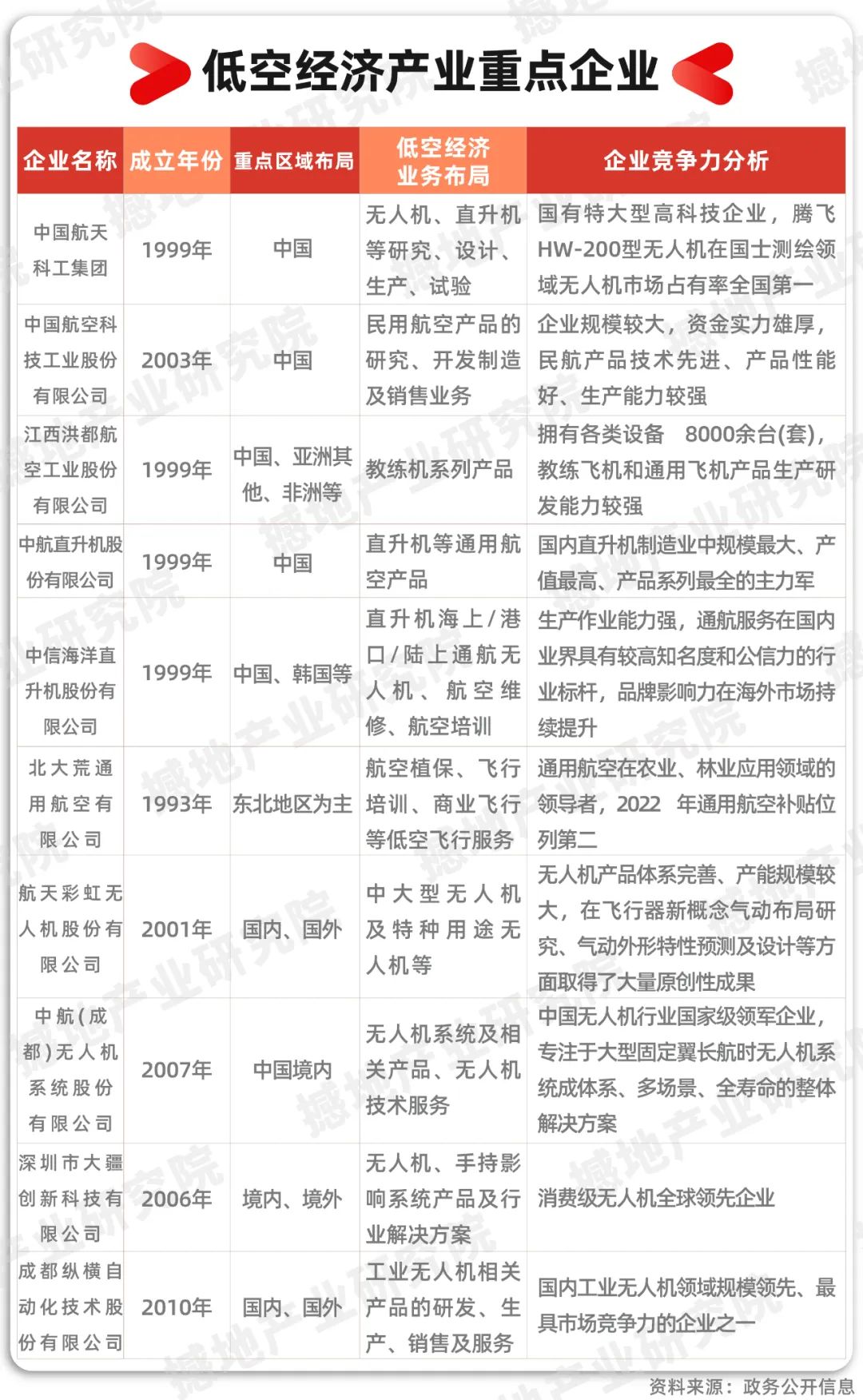 通用航空是低空经济的主体产业,无人机是低空经济的主导产业。通用航空领域主要企业有中航工业、北大荒、中信海洋与中直股份;无人机领域主要企业有大疆、航空工业与航天彩虹等。