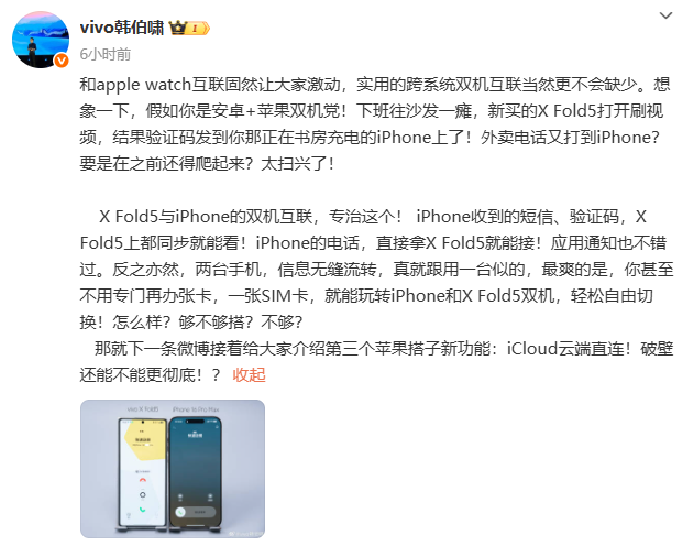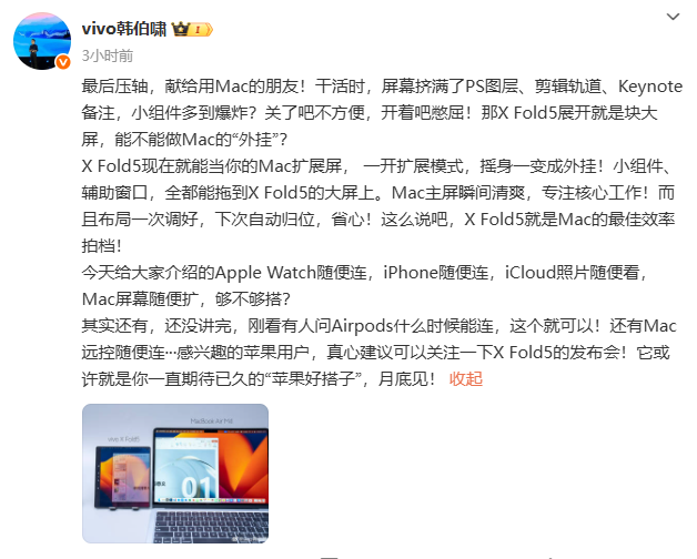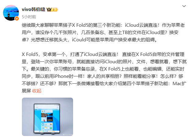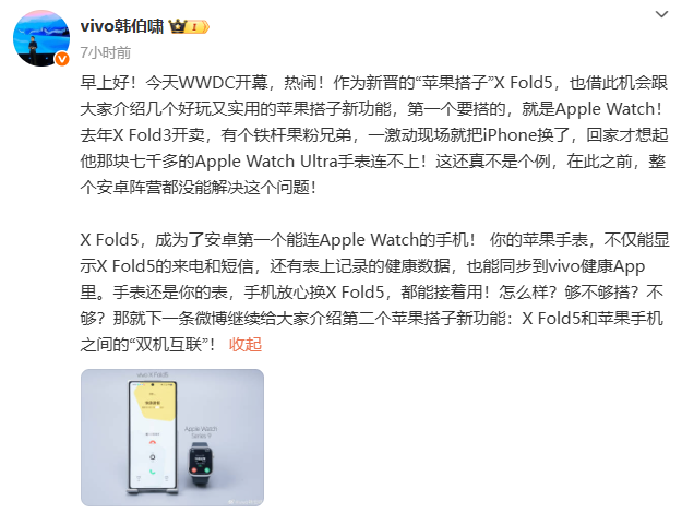 今天WWDC开幕,作为新晋的“苹果搭子”X Fold5,vivo 通信科技有限公司产品经理韩伯啸微博发文宣布,vivo X Fold5 在Apple Watch随便连,iPhone随便连,iCloud照片随便看,Mac屏幕随便扩,四个功能让人大开眼界。