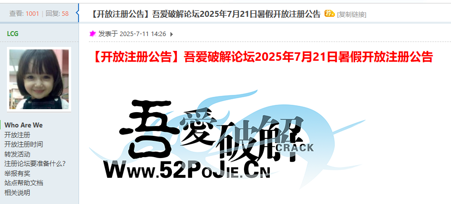 我们在官方微信和微博收到很多朋友发来的消息,想加入论坛学习交流逆向分析技术,为了让论坛融入更多的新生血液,吾爱破解论坛管理团队商议决定限时开放注册。