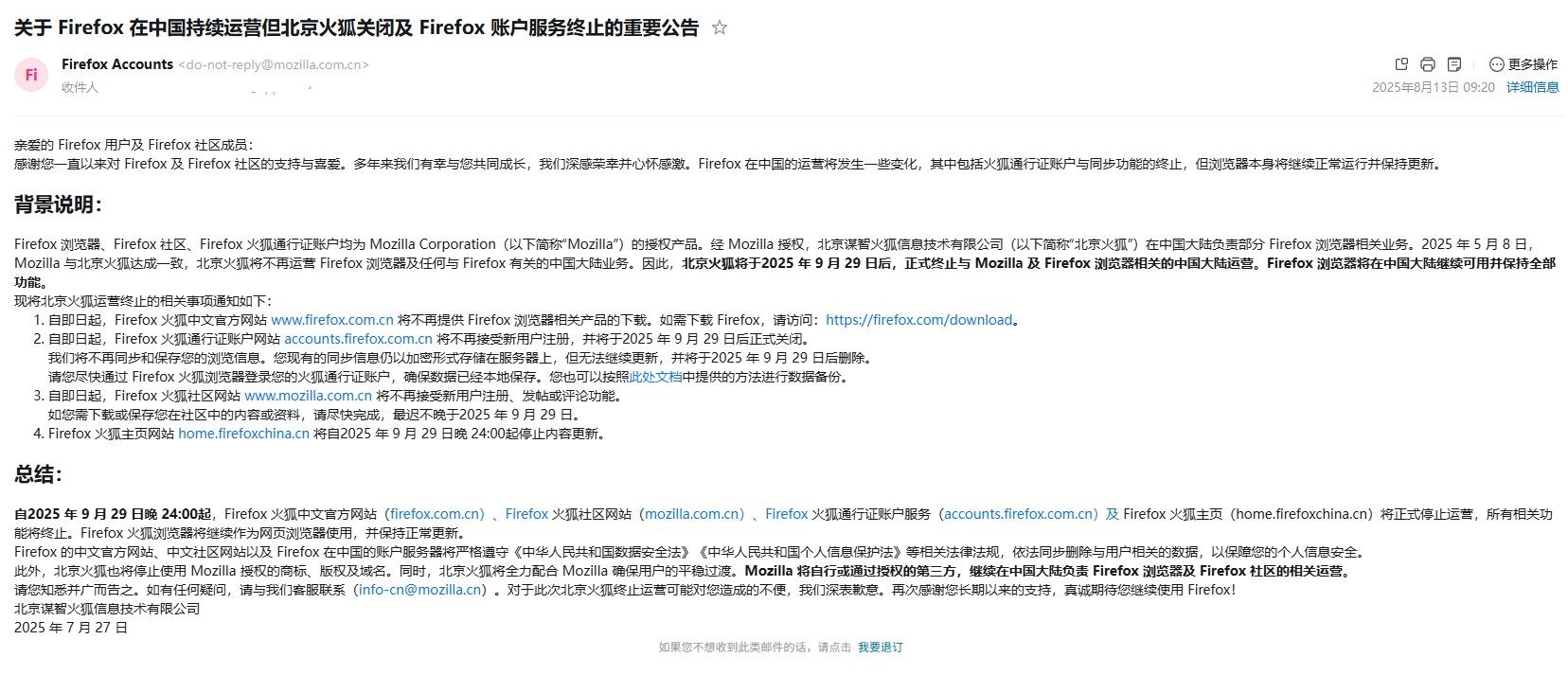 请您知悉并广而告之。如有任何疑问,请与我们客服联系(info-cn@mozilla.cn)。对于此次北京火狐终止运营可能对您造成的不便,我们深表歉意。再次感谢您长期以来的支持,真诚期待您继续使用 Firefox!