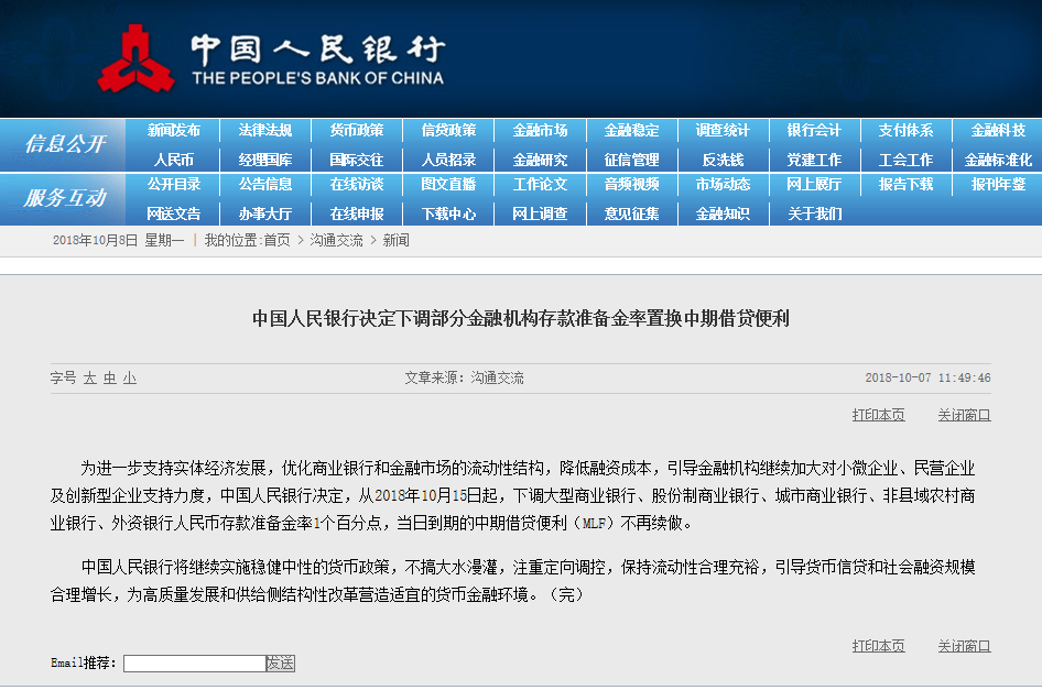今天(10月07日)11点53分,央行宣布:自2018年10月15日起,下调大型商业银行、股份制商业银行、城市商业银行、非县域农村商业银行、外资银行人民币存款准备金率1%。这是年度金融市场又一重大事件。