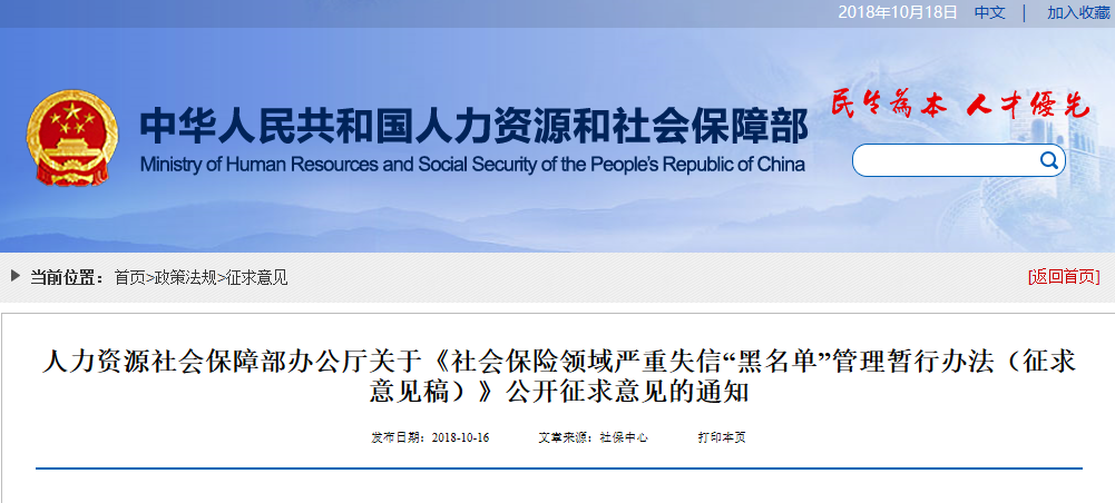 为推进社会保险领域信用体系建设,切实维护用人单位和参保人员合法权益,保障社会保险基金安全运行,根据《社会保险法》(中华人民共和国主席令35号)、《社会信用体系建设规划纲要(2014—2020年)》(国发〔2014〕21号)、《国务院关于建立完善守信联合激励和失信联合惩戒制度加快推进社会诚信建设的指导意见》(国发〔2016〕33号)等有关规定,人社部制定了《社会保险领域严重失信“黑名单”管理暂行办法(征求意见稿)》。现向社会公开征求意见。公众可以通过以下途径和方式提出意见: