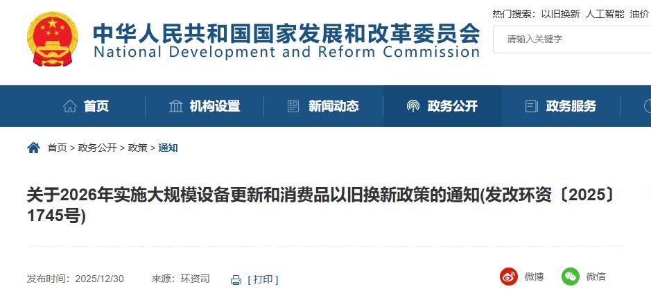 为全面贯彻党的二十大和二十届历次全会精神,认真落实中央经济工作会议部署,根据《推动大规模设备更新和消费品以旧换新行动方案》(国发〔2024〕7号),经国务院同意,现就2026年实施大规模设备更新和消费品以旧换新政策通知如下。