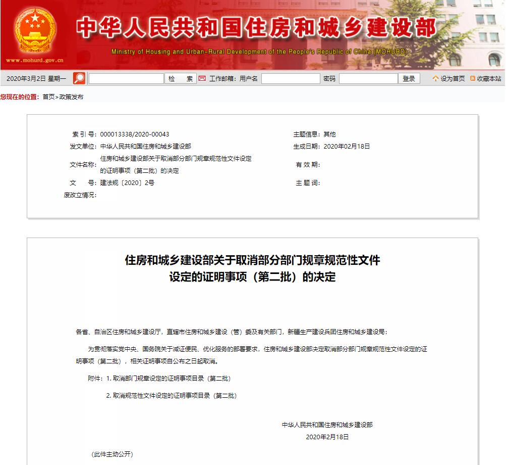 为贯彻落实党中央、国务院关于减证便民、优化服务的部署要求,住房和城乡建设部决定取消部分部门规章规范性文件设定的证明事项(第二批),相关证明事项自公布之日起取消。