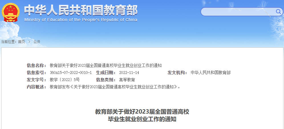 党的二十大明确指出,人才是第一资源,实施就业优先战略,强化就业优先政策,健全就业促进机制,促进高质量充分就业。高校毕业生是国家宝贵的人才资源,是促进就业的重要群体。为深入学习贯彻党的二十大精神,全面落实党中央、国务院对高校毕业生就业创业工作的决策部署,教育部决定实施“2023届全国普通高校毕业生就业创业促进行动”,各地各高校要切实增强责任感使命感,紧密结合实际,创新思路举措,千方百计促进高校毕业生多渠道就业创业,奋力开创高校毕业生就业创业工作新局面。现就做好2023届高校毕业生就业创业工作通知如下。