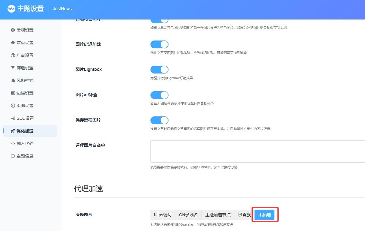 【主题设置】→【优化加速】→【代理加速】→【头像图片 改为“不加速”】→【保存设置】