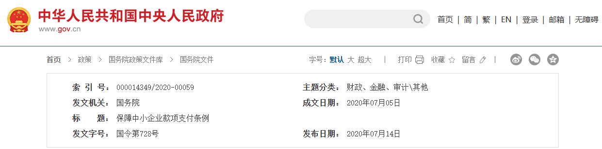 《保障中小企业款项支付条例》已经2020年7月1日国务院第99次常务会议通过,现予公布,自2020年9月1日起施行。