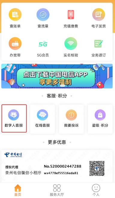 首先通过微信小程序 “贵州电信”进入开始操作: