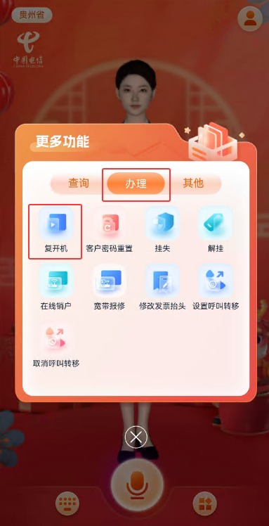 电信手机号登陆后【数字人客服】→【更多功能】→【办理】→【复开机】→【输入手机号 如:189808540000】→【输入:姓名 身份证号码】→【进行核验】